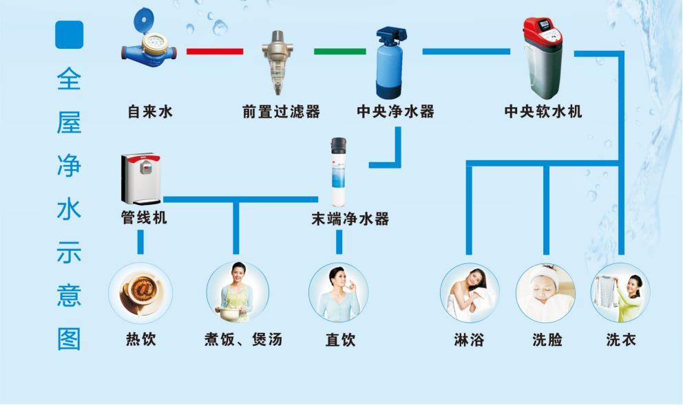 首先,讓我們看一張圖!這張圖就將凈水器及全屋凈水器系統進行了很好的闡述,哪種產品主要的功能是什么,一看便知!