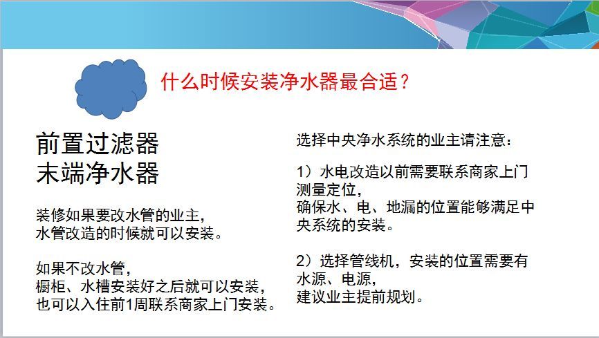 中央凈水器、中央飲水機:這類產品其實是兩種情況,一是用戶量大,二是對用戶要求更高的業(yè)主,一般裝修,建議前置加末端凈水器,就能滿足日常生活起居。